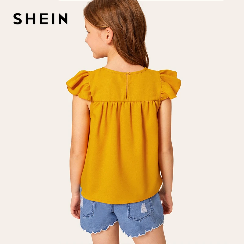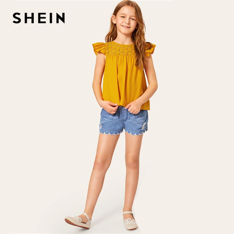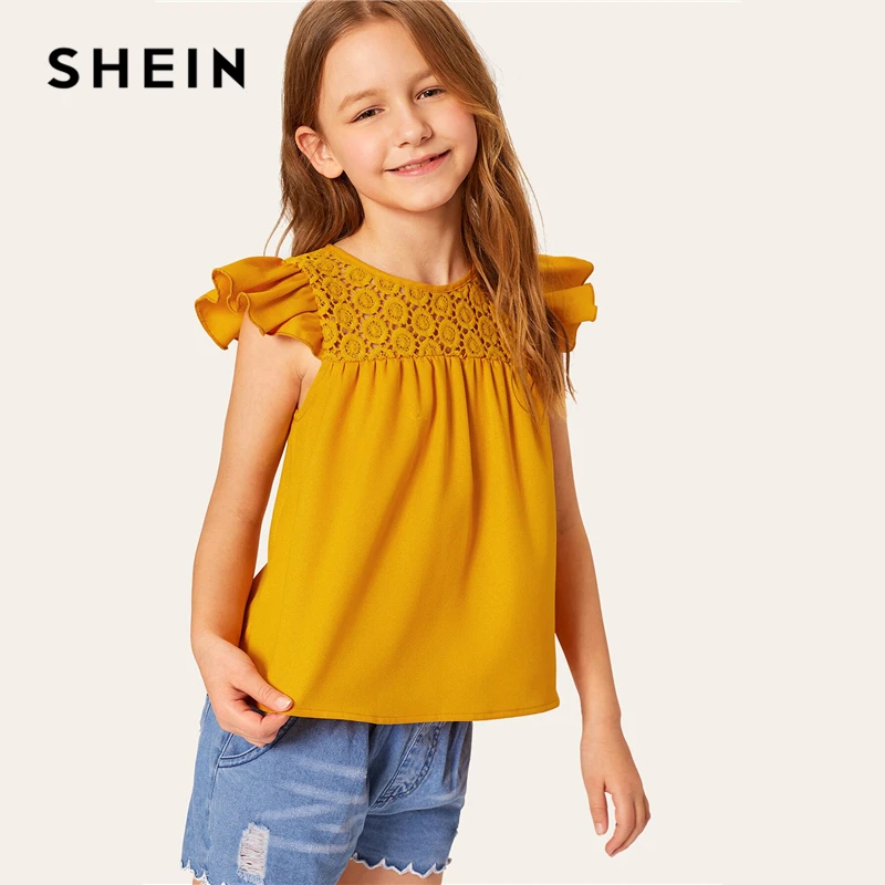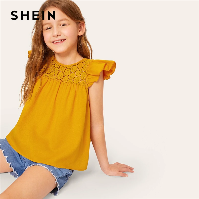 low cost SHEIN Kiddie Ginger Solid Lace Insert Ruffle Armhole Teenagers Cute Blouse 2019 Summer Butterfly Sl