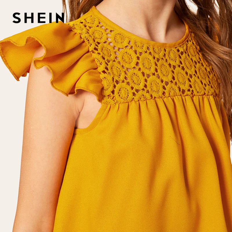 Greatest SHEIN Kiddie Ginger Solid Lace Insert Ruffle Armhole Teenagers Cute Blouse 2019 Summer Butterfly Sl